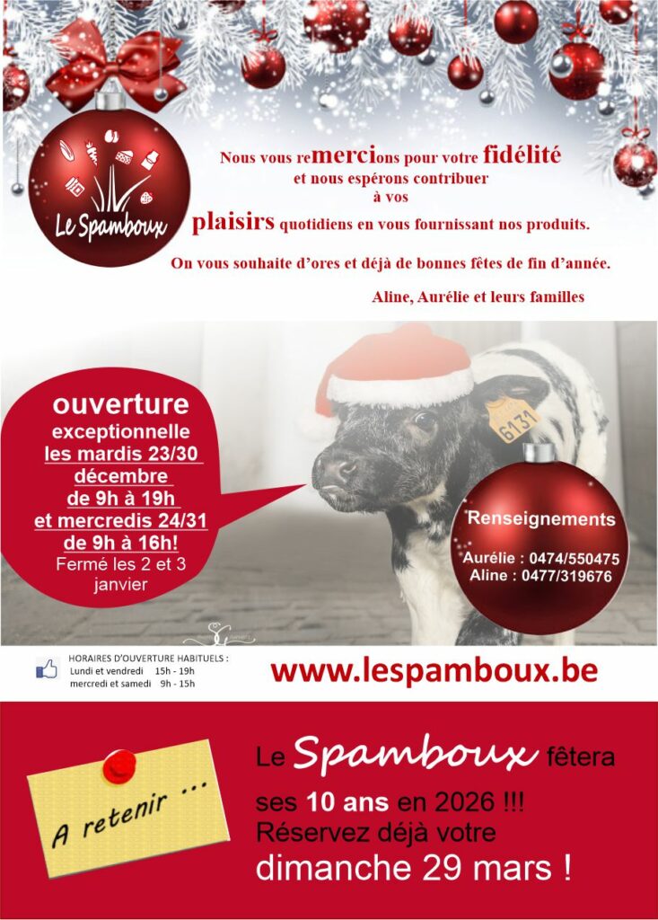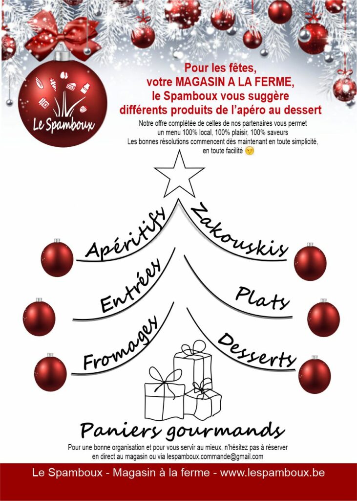 Paniers gourmands, zakouskis, plateaux fromages, plateaux raclette, chicons de terre, gâteaux glacés du Mont-Blanc cinacien, foie gras de la Sauvenière, saumon de chez Fumoir et Terroir, boudin de l’Atelier du Boucher, …